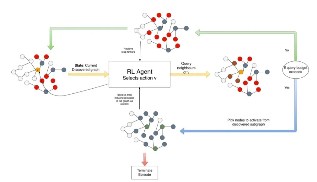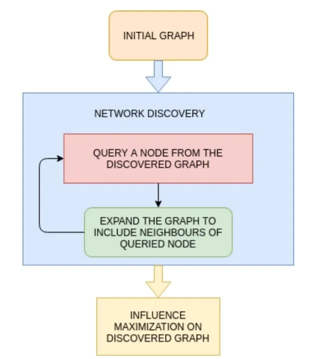 The method developed by the team can be used by a researcher who intends to find influencers in a social network. To carry out such a study, the researcher should know a few people of this network and their neighbors which may help to form an initial social network graph. This social network graph is not a complete graph but rather a subset of the graph. This data can be fed into the reinforcement program developed by the team. The program will query the nodes or people of this graph and will try to identify nodes or people with maximum connections or large influence on the network. As the researcher queries an additional person about his/her neighbors, more information will be added in this graph and the program will be able to again form a new network and based on this network come up with the nodes or people who have maximum influence in the social network. These information addition steps can be repeated multiple times and every time a new and better social network closer to the actual social network will be obtained and the influencers will be identified.