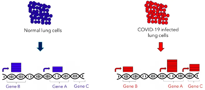COVID-19 infected lung cells: Here, all three genes are active (“on”), and gene A is transcribed more as compared to genes B and C.