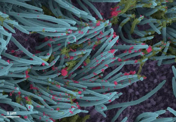 This colorized scanning electron microscope (SEM) image published recently in the New England Journal of Medicine [3], came out of the lab of Dr. Camille Ehre at the University of North Carolina at Chapel Hill. The lung cells (purple) were infected by the many thousands of coronavirus particles (red). The inner surface of the airways is covered by hair-like cilia (in blue) and helps to clear mucus (yellow-green).